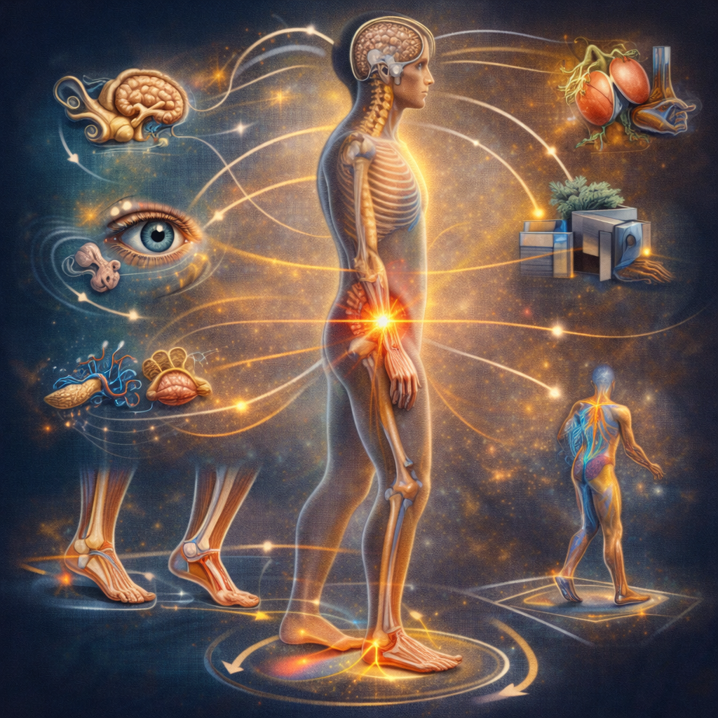 A propriocepção organiza a percepção corporal e sustenta o equilíbrio. Sua integridade é essencial para a estabilidade e o movimento.